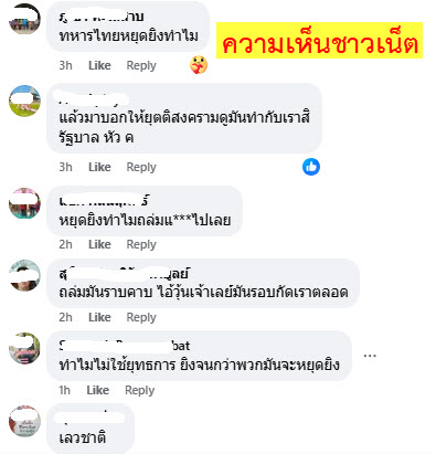 จากโพสดังกล่าวมีชาวเน็ตที่ติดตามสถานการณ์การสู้sบตามแนวชายแดนไทย-กัมพูชา เข้ามาแสดงความเห็นว่า ทหารไทยหยุดยิ งทำไม, แล้วมาบอกให้ยุติสงคsามดูมันทำกับเราสิ, ถล่มมันราบคาบ ไอ้วุ้นเจ้าเลย์มันรอบกัดเราตลอด ความเห็นดังกล่าวที่ร่วมกันเม้นเข้ามา